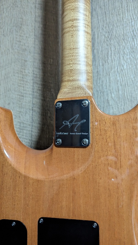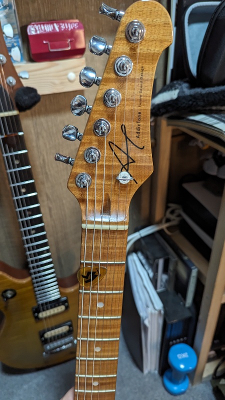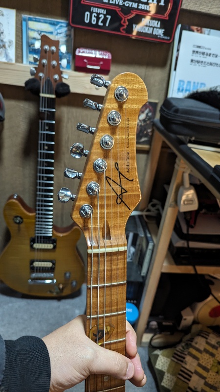 位置は当初ストラトキャスターなどに多い5弦チューナー辺りにしようかと思いましたが、Addictoneのロゴが大きく、そこだと被ってしまうので極力被らない位置に設置してみました。
