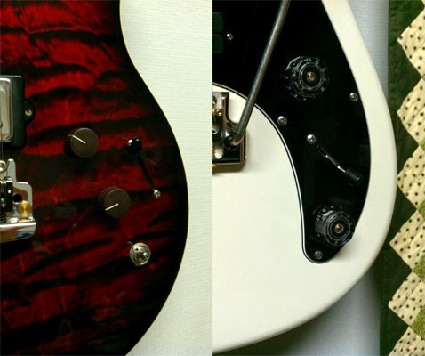 通常よくあるタイプは画像の左側のようにボリューム・トーンが一列になっていて、ボディーの外側にピックセレクターがあるんですが、NF3はボリュームとトーンの間にピックセレクターが配置されているんですね。
