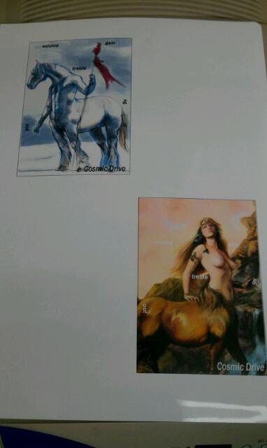 まずはCosmic Driveの元となっているCentoure(ケンタウルス)の絵を探し出し、イラストレーターでケースの大きさに合わせ縮小(実寸よりも上下左右に各2ミリ程空白を設けました)、ノブの位置に合うように『gain』やら『treble』の文字を入れて、水に濡れても大丈夫なシールシートに印刷。