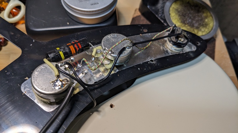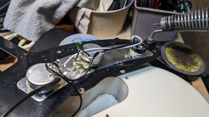 ただ、やはりというかコンデンサーや配線材はちょっと陳腐なものが使用されていたので'55 レスポール リシューに載ってたBumble Bee 0.022 400vと、一番音が変わりやすいジャック部分の配線材を1960's Western Electric 20AWGに交換しときました。