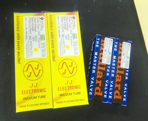 これは先月ヴィンテージサウンドのフリーオーダーメイドチョイスしてもらったMullard(EL84)とJJ(6V6)です。