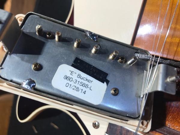またCustom Buckerはピックアップの裏側は通称PAFと呼ばれる切っ掛けとなるシールだけが貼ってパッと見だけではモデルを分別するのが難しいんですが、E-Buckerには画像のように珍しくモデル名が分かるように別にシールが貼ってあるんですね。