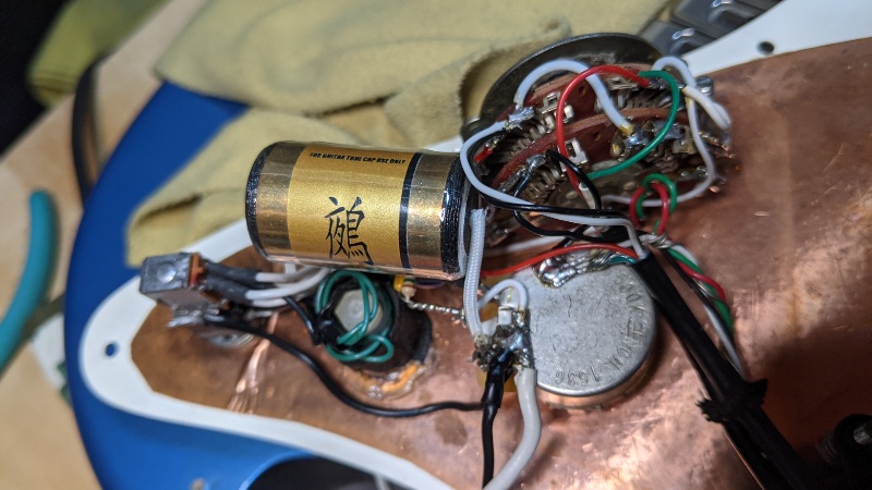 前オーナーがMidrange on potの回路を切って新たにタップ回路に切り替えたのは、シングルをメインでの使用と考えていたのがこのコンデンサーの数値から推測されます。