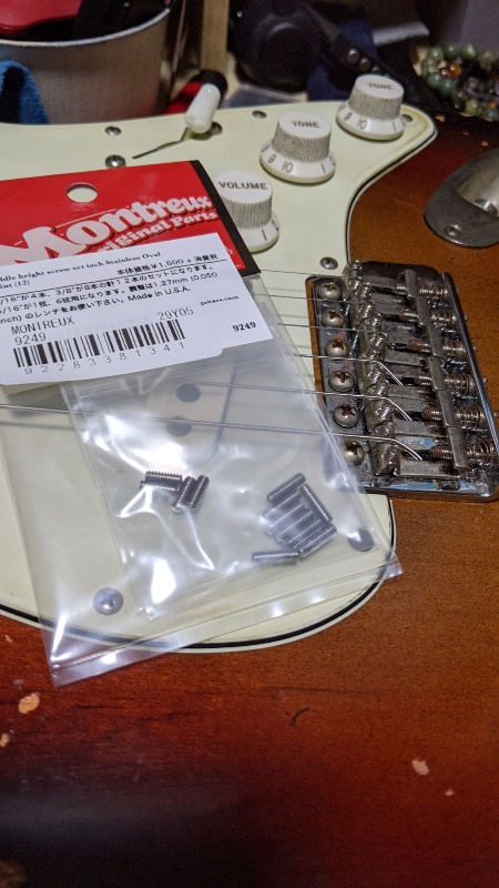 このMONTREUXのサドルネジはイモネジがプレートに当たる部分がいわゆるオーバル状になっていて、弦振動がよりダイレクトに伝わるとのこと。