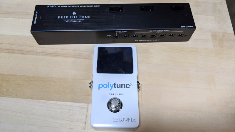 今まで電源関係が3つ(電源タップ1つにDCタップ2つ)だったのがPT-5D1つに集約され、またバッファとチューナーもPOLYTUNE3だけになったのでかなりスッキリとなりました。