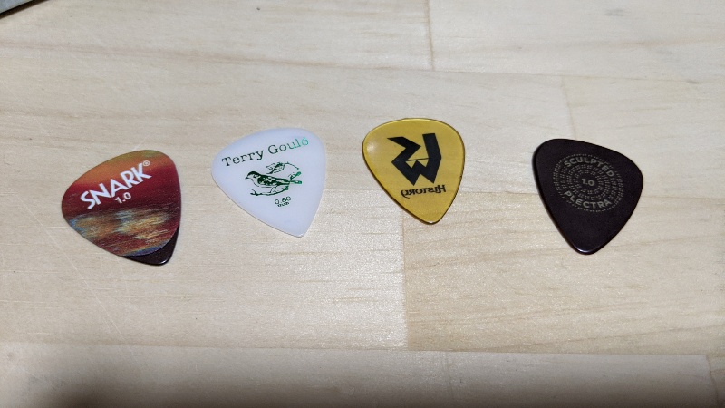 左側からSNARK 1.0mm、Terry Gould 0.8mm、History 渡辺香津美シグピック 1.0mm、Jim Dunlop 511P 1.0mmです。