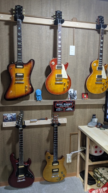 ドアを開けた正面にうまく5本壁掛けにし、入口付近に置いたアンプの上部にエレアコ、また入り組んだ納戸的なスペースに更に1本壁掛けできる用にしました。