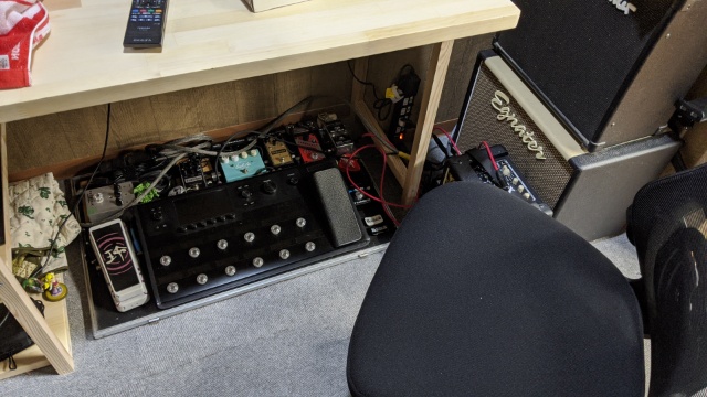 それと懸念していたエフェクターボードの収納ですが、作業机兼テレビ台をオーダーメイドで作製してもらい、ボードがキチンと収まるようにスペースを設けてもらいました。