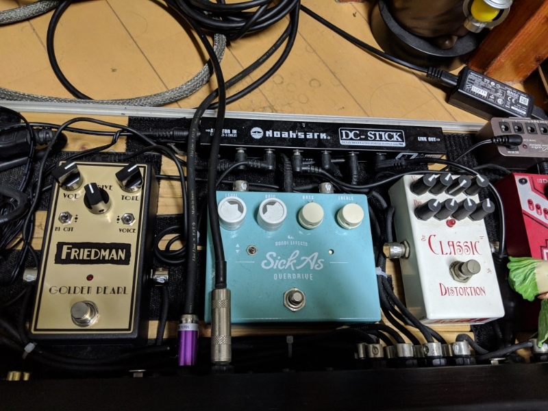 現在ブースターにはSick Asを使用中だったんですが、ノイズの少なさやどこまでも続きそうなサステイン、後段の歪みを全くスポイルしない音に感銘を受け、すぐさまバトンタッチ。