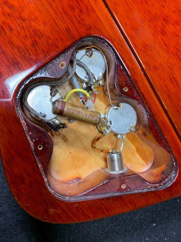 ついでにピックアップ交換時に気になっていた脆弱な配線材を、ちゃんとしたシールディング効果のあるものに変えようと、オールドのシールドワイヤーを入手し交換してもらいました。