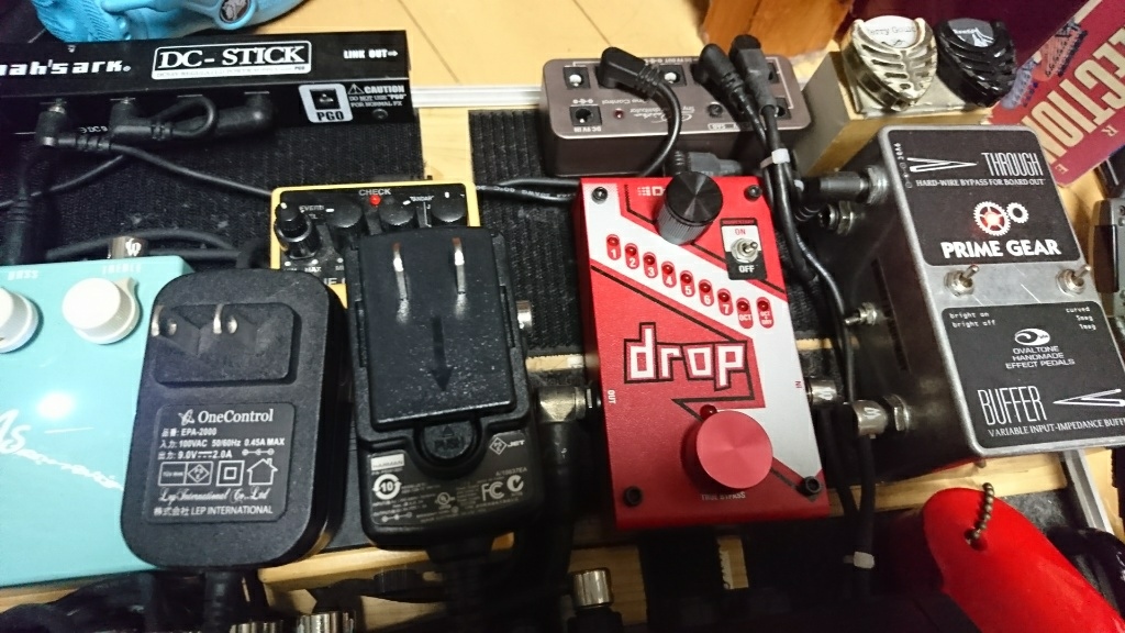 最初はデジタル用パワーサプライのワン・コントロールを交換しようかと考えてたんですが、ひょんな事からdropは付属の専用アダプターを使用した方が効果を100%引き出せるというコメントを読み、確かにと納得させられたので、早速ワン・コントロールのアダプターをデシテックのアダプターと弾き比べてみたところ、音の遅延が全くと言っていいほど無くなったのには驚かされました。
